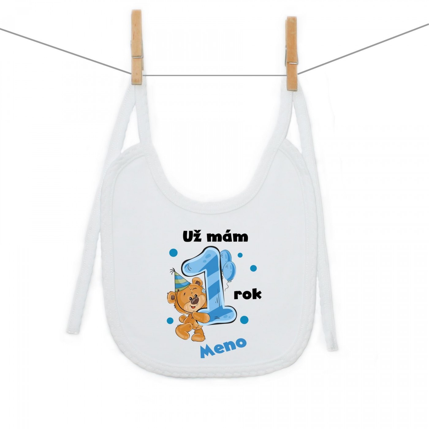 Podbradník na zaväzovanie Už mám 1 rok s Medvedíkom a menom dieťatka Chlapec